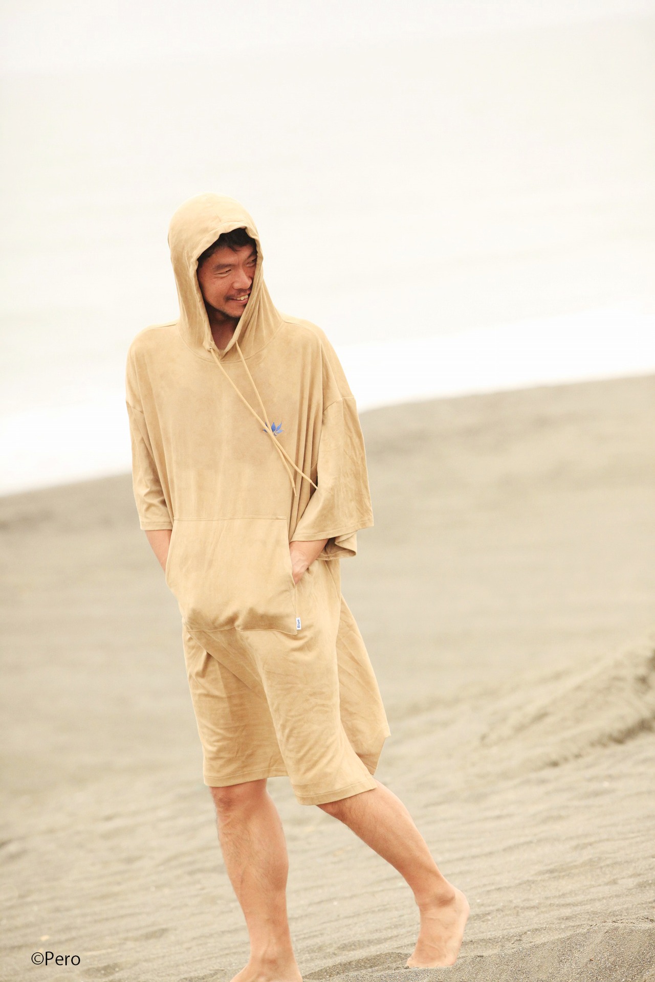 本体カラーにはベージュを採用、腹部には「Blue.」とのコラボピスネームを控えめに取り付けた大きなカンガルーポケットを装備し、小物入れとしても使える付属のメッシュポーチにコンパクトに収納可能なのでサーフトリップにも携行できます。